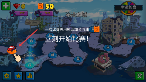2、在游戲地圖界面,點(diǎn)擊 “STADIUM” 等解鎖區(qū)域,按照提示 “立刻開始比賽!”,消耗汽油開啟比賽。