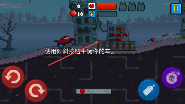 3、進(jìn)入比賽關(guān)卡后,利用屏幕上的操作按鈕(如傾斜按鈕)控制紅色小車,平衡車輛,收集鉆石等道具,完成關(guān)卡任務(wù)。