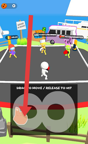 3、進(jìn)入戰(zhàn)斗場(chǎng)景(第三張圖,多人對(duì)戰(zhàn)擂臺(tái)),根據(jù)提示“DRAG TO MOVE/RELEASE TO HIT”,滑動(dòng)虛擬搖桿。
