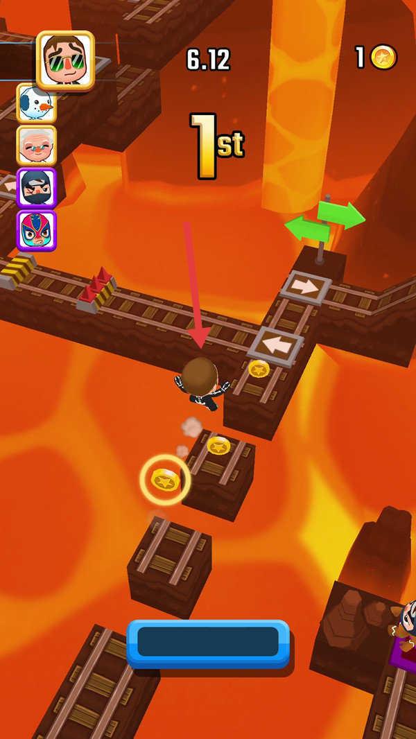 3、游戲中操控角色沿軌道奔跑,收集金幣,遵循箭頭指示方向,躲避障礙,保持【1st】排名,完成跑酷挑戰(zhàn),收獲獎勵與成就感。
