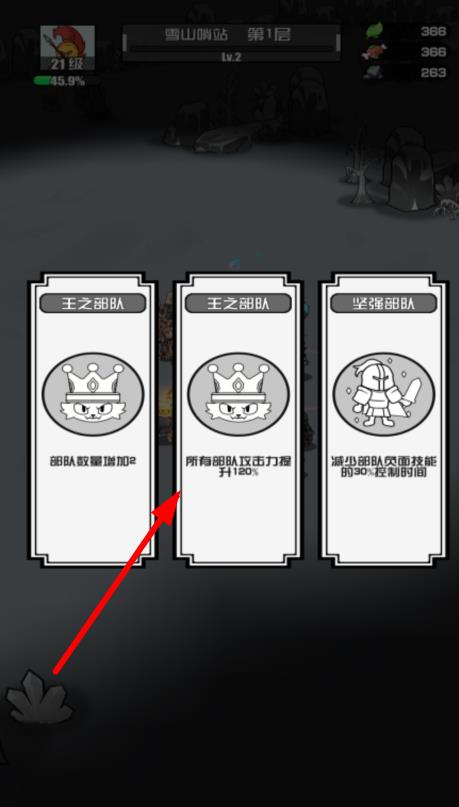 2、行進途中收集地圖中的增益buff,擊敗敵人獲取經(jīng)驗,觸發(fā)三選一技能選擇機會,從50余種技能中搭配戰(zhàn)斗組合。