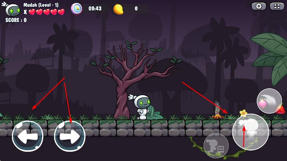 1、用左右按鍵控制角色在叢林場景移動,遇敵人時,點(diǎn)擊技能鍵釋放攻擊,擊敗敵人推進(jìn)關(guān)卡。