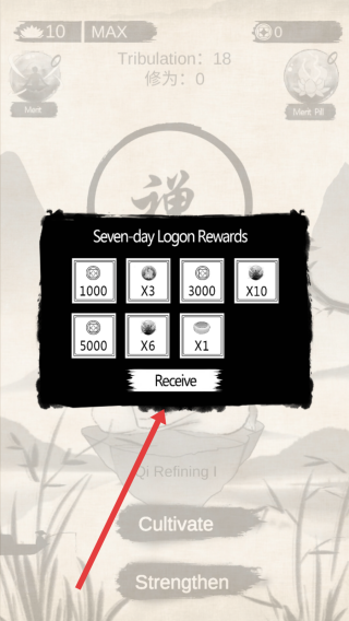 1、進(jìn)入游戲主界面后,按照箭頭提示點(diǎn)擊“簽到”按鈕領(lǐng)取每日登錄獎(jiǎng)勵(lì)(如金幣、道具等)。