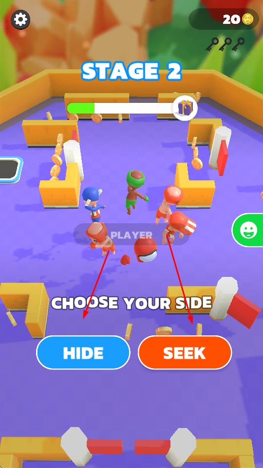 1、開(kāi)局選“HIDE”或“SEEK”陣營(yíng),不同陣營(yíng)目標(biāo)不同,躲藏者要藏好,搜尋者要找出躲藏者。