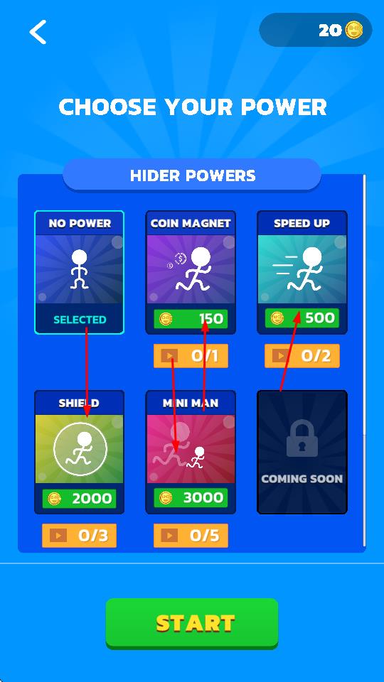 2、選躲藏者可在賽前用金幣買特殊能力,提升躲藏、收集資源效率。
