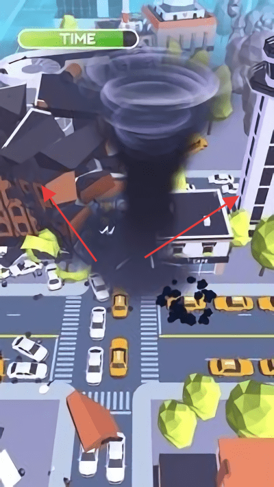 1、基礎(chǔ)移動與破壞操作:使用虛擬搖桿控制龍卷風(fēng)的移動方向,靠近物體時自動產(chǎn)生吸力,將物體卷入空中并摧毀,不同大小與材質(zhì)的物體需要不同的吸力與破壞力才能摧毀。
