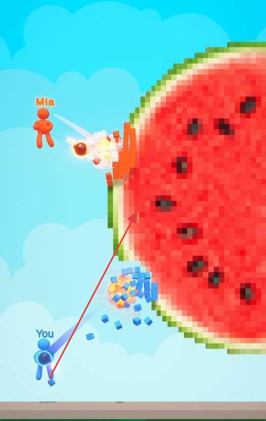 2、面對(duì)巨型西瓜目標(biāo),分析其像素結(jié)構(gòu),讓【You】和【Mia】的彈體配合,攻擊西瓜色塊銜接處、籽周圍等易破碎區(qū)域,高效擊碎西瓜。