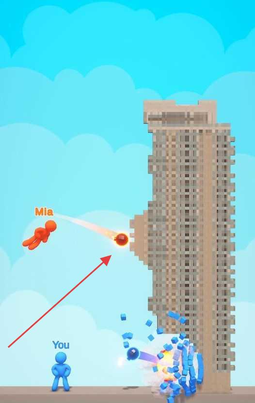 1、進(jìn)入關(guān)卡,觀察建筑(或目標(biāo)物)結(jié)構(gòu),控制藍(lán)色小人【You】發(fā)射彈體,瞄準(zhǔn)橙色小人【Mia】或建筑薄弱處,借彈體撞擊摧毀建筑。