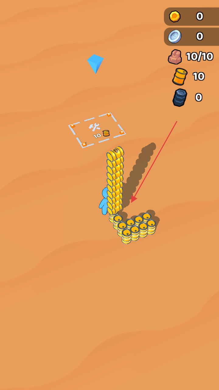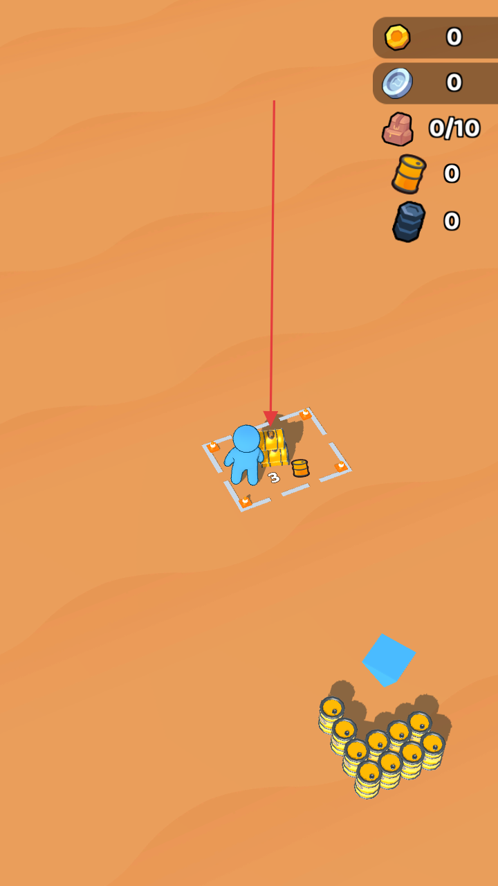 1、進(jìn)入游戲場(chǎng)景,操控藍(lán)色小人移動(dòng),靠近金幣堆等資源,自動(dòng)收集金幣、石油桶等,積累基礎(chǔ)資源。
