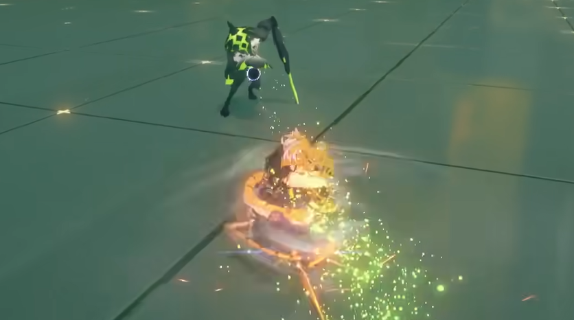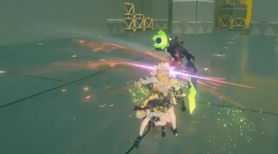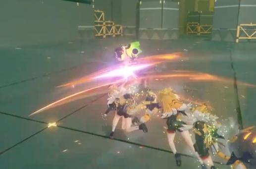 3、場(chǎng)景融合:工業(yè)風(fēng)場(chǎng)地(鋼架背景)與技能特效聯(lián)動(dòng)(斬?fù)敉嫌?、地面光痕),將環(huán)境化為戰(zhàn)斗表現(xiàn)的延伸,強(qiáng)化“場(chǎng)景→戰(zhàn)斗”的沉浸關(guān)聯(lián)。