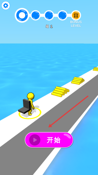 1、點(diǎn)【開(kāi)始】,控黃人推金幣堆,沿水上道路,收集金條,避落水。