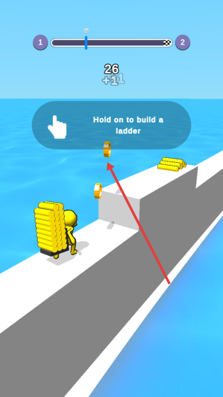 2、遇高臺(tái),長(zhǎng)按“Hold on to build a ladder”,用金幣搭梯,翻越障礙,續(xù)跑。