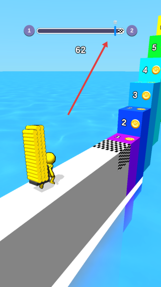 3、沖彩色階梯(1-5級(jí)),吃金幣,攢62進(jìn)度,到終點(diǎn),贏獎(jiǎng)勵(lì),解鎖新角色。