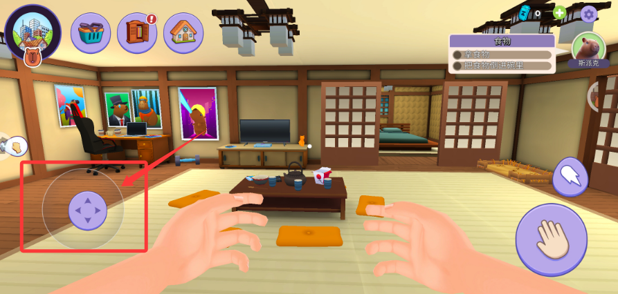 1、在房間場景中,通過左側虛擬搖桿操控角色移動,前往廚房區(qū)域尋找互動點。