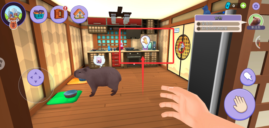 2、到達廚房后,點擊對應交互標識來獲取食物道具,為喂養(yǎng)動物做準備。