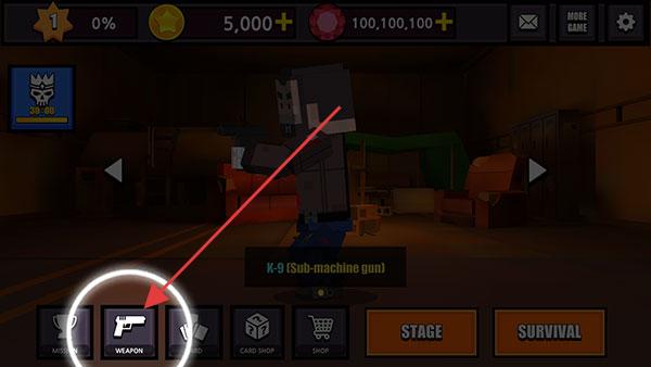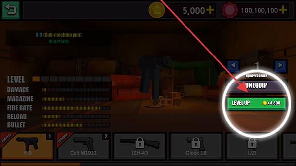 1、武器界面,選“K-9”沖鋒槍,點擊【LEVEL UP】,花費金幣提升等級,增強(qiáng)武器屬性,助力戰(zhàn)斗。