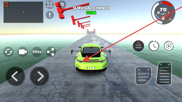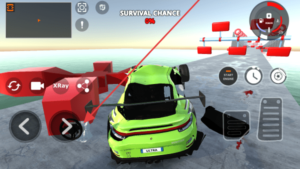 2、遇到紅錘障礙,提前減速、轉(zhuǎn)向,減少碰撞傷害;若觸發(fā)高難度撞擊(生存概率0%),利用“重置”(左上角箭頭)。