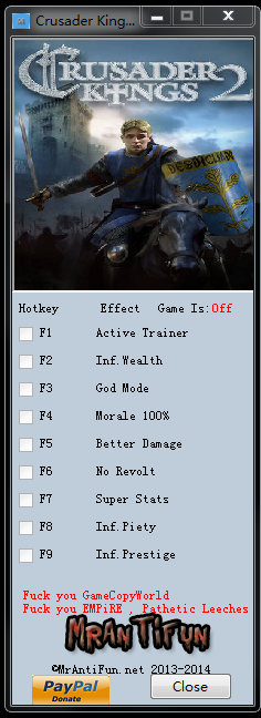 十字軍之王2 2.63修改器是為這款游戲制作的強(qiáng)大游戲修改工具,下載后玩家可按照下方使用說(shuō)明操作即可成功修改游戲,獲得更好更多的游戲體驗(yàn),喜歡這款游戲的朋友快來(lái)下載吧!
