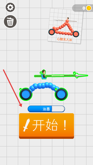 1、點(diǎn)擊【油墨】按鈕,為藍(lán)色部件上色,按圖紙“心酸無人訴”樣式,搭建角色載具結(jié)構(gòu)。
