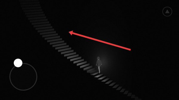 3、需要按照沿箭頭方向,讓角色走上階梯,深入探索場(chǎng)景,在黑暗環(huán)境中開(kāi)啟新的冒險(xiǎn)階段。