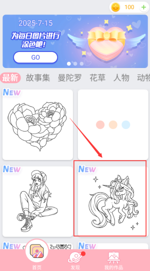 1、點(diǎn)擊NEW獨(dú)角獸圖片,選擇開始填色游戲。
