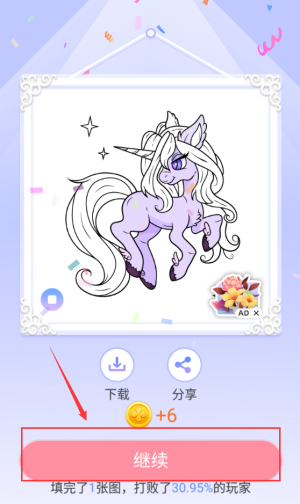 4、點(diǎn)擊粉色繼續(xù)按鈕,查看填色完成進(jìn)度。