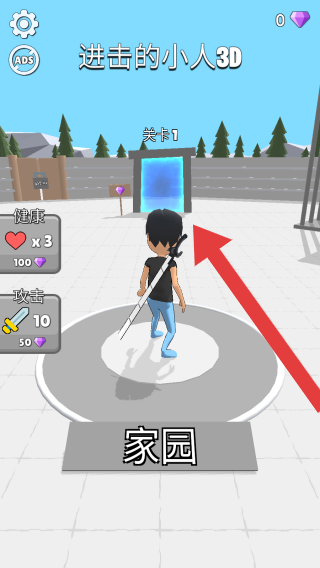 1、處于家園場景,顯示關(guān)卡1入口,角色有健康×3、100、攻擊10、50屬性,點擊關(guān)卡1方可進入。