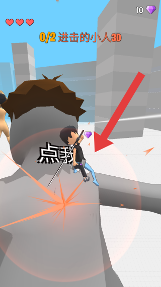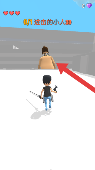 2、顯示任務(wù)進度0/1,角色持有武器,上方有3顆愛心、0顆鉆石,呈現(xiàn)追逐敵人前方角色的戰(zhàn)斗場景。