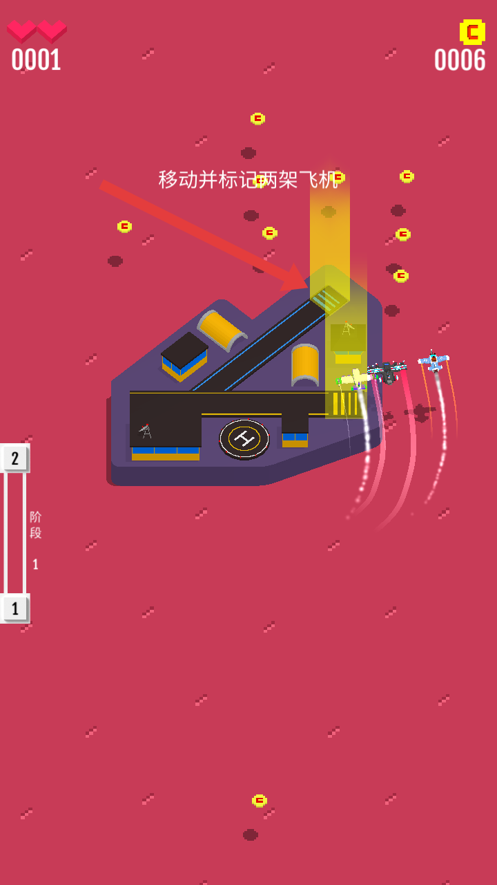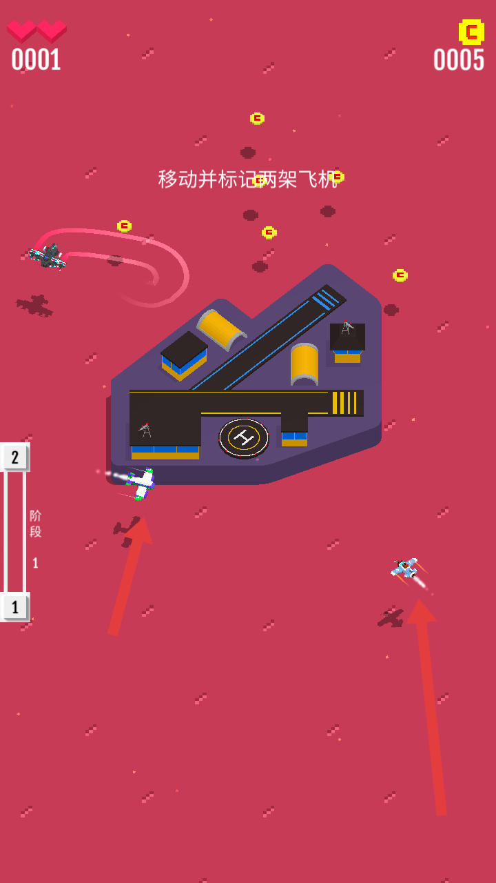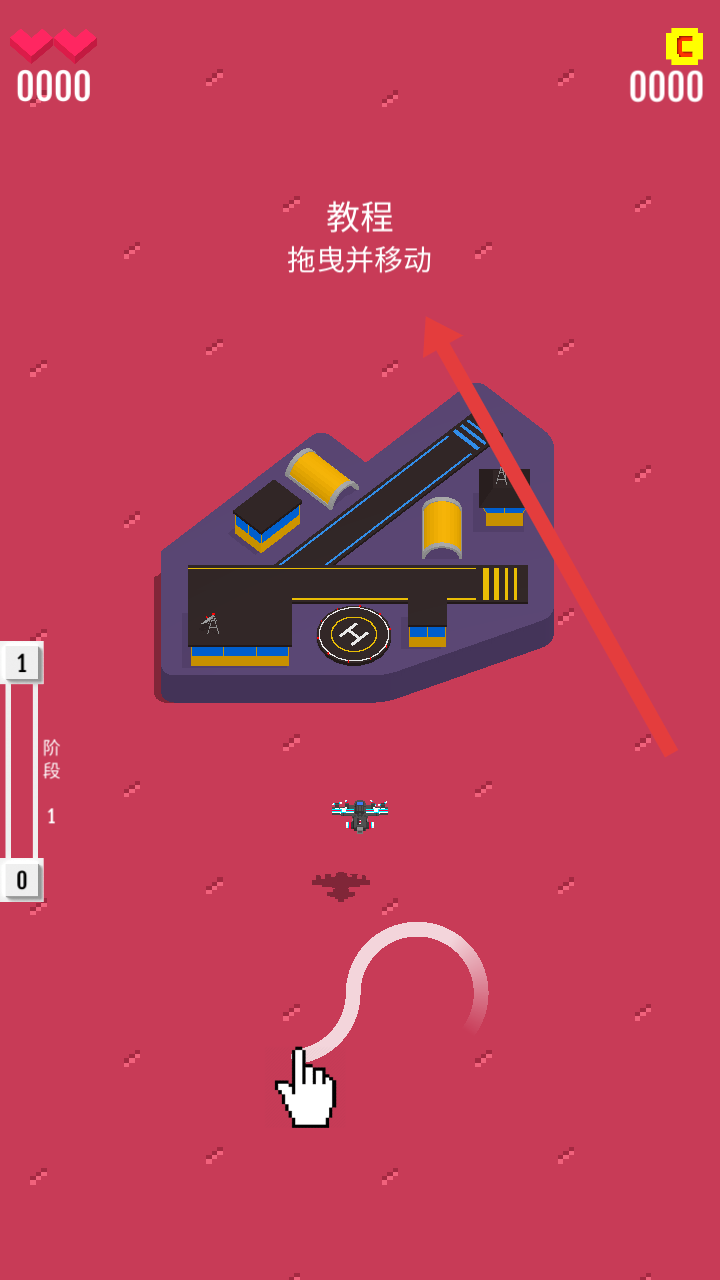 1、在游戲教程的階段,盯著下方小飛機,需要用手指拖曳它,畫道軌跡線,順道撿空中的金幣。