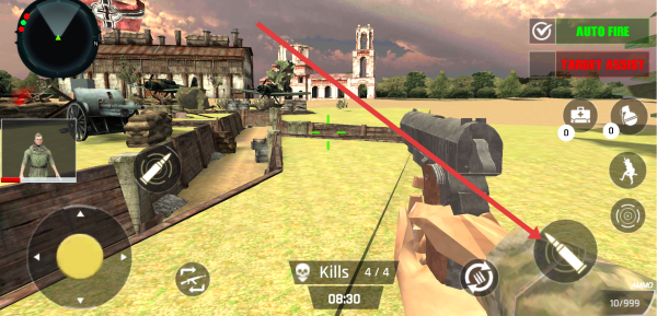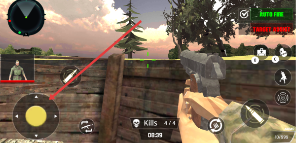 1、開(kāi)局選SINGLEPLAYER MODE單人模式,熟悉虛擬搖桿移動(dòng)、射擊按鈕操作,用手槍瞄準(zhǔn)敵人。