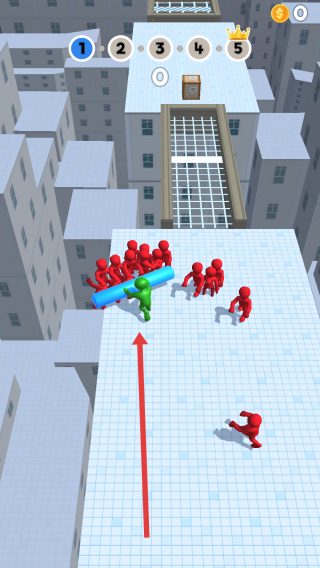 2、在屋頂場(chǎng)景,滑動(dòng)屏幕操控綠色角色,利用藍(lán)色長(zhǎng)條形武器,擊退紅色敵人,推進(jìn)關(guān)卡進(jìn)程。