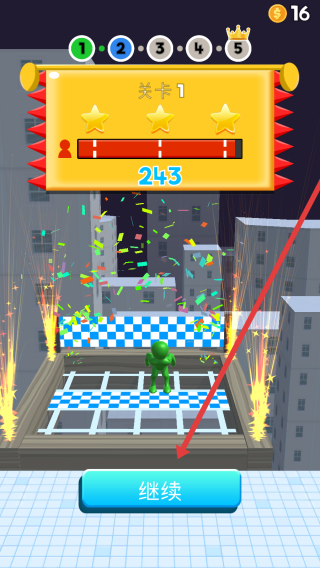 3、成功通關(guān)后,在顯示關(guān)卡1、24:3及獎(jiǎng)勵(lì)的界面,可以通過(guò)點(diǎn)擊繼續(xù)按鈕,進(jìn)入下一關(guān)挑戰(zhàn)。
