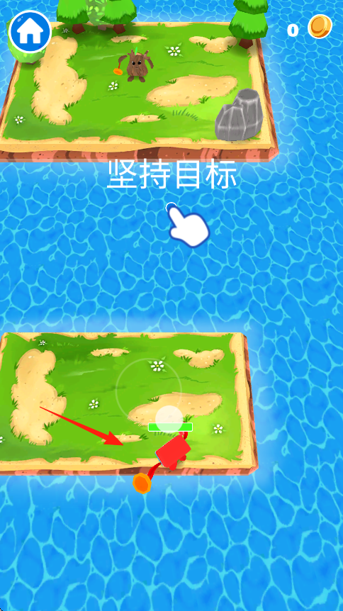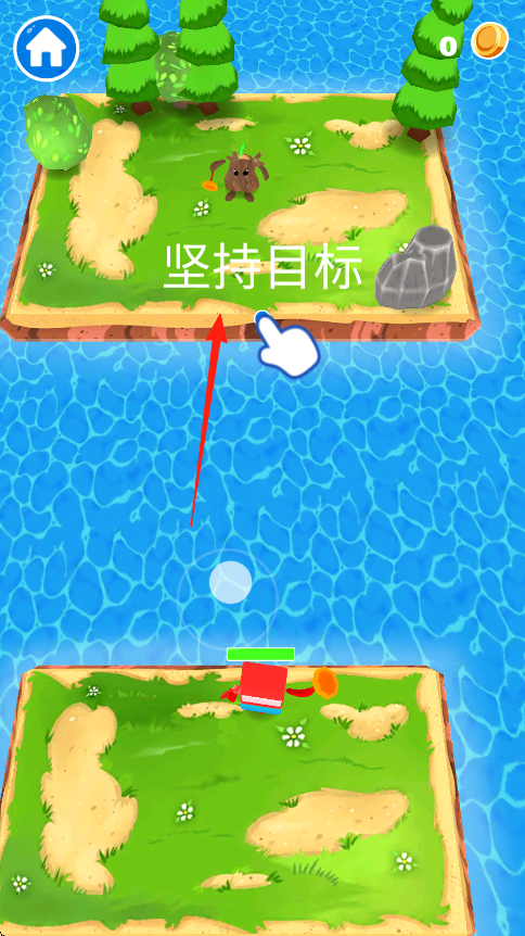 1、在雙島場景,跟隨堅持目標(biāo)提示及手指指引,操控紅色角色帶橙色部件,從下島出發(fā),準(zhǔn)備前往上島。