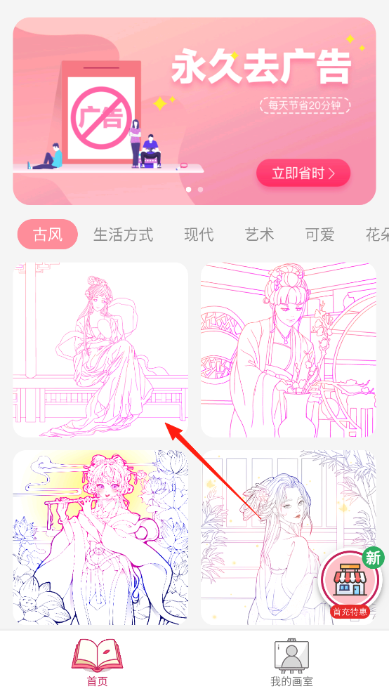1、進入古風(fēng)涂色,瀏覽不同風(fēng)格的涂色畫作,點擊古風(fēng)分類下的線稿,進入涂色流程,借助分類選擇機制,開啟特定主題創(chuàng)作,通過操作,感受風(fēng)格篩選與創(chuàng)作啟動的互動。