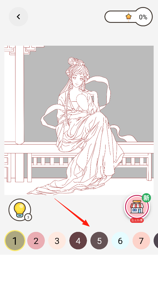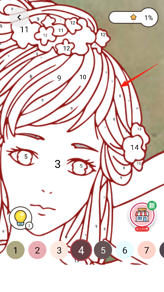 3、進入數(shù)字涂色模式,線稿標有數(shù)字對應(yīng)顏色,點擊數(shù)字區(qū)域,自動填充指定色彩,精準上色,通過操作,完成細節(jié)繪制,感受數(shù)字引導(dǎo)創(chuàng)作的樂趣,完善畫作細節(jié)。