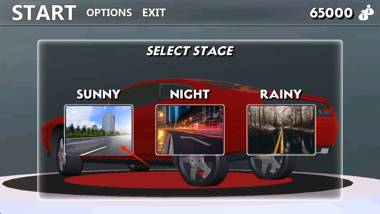 2、進(jìn)入關(guān)卡選擇場(chǎng)景,根據(jù)箭頭提示,選擇Sunny關(guān)卡,確定比賽路線,為賽車(chē)挑戰(zhàn)做好準(zhǔn)備,點(diǎn)擊選擇地圖。