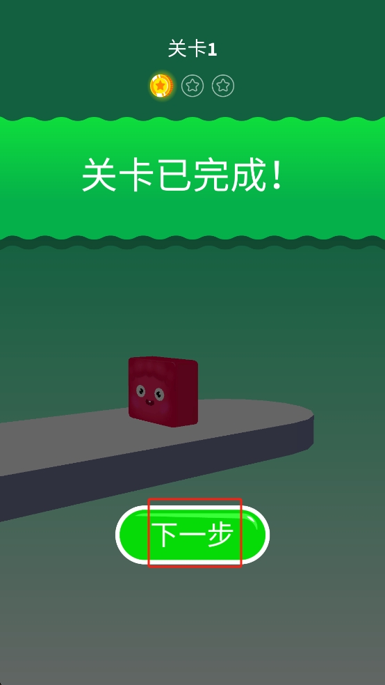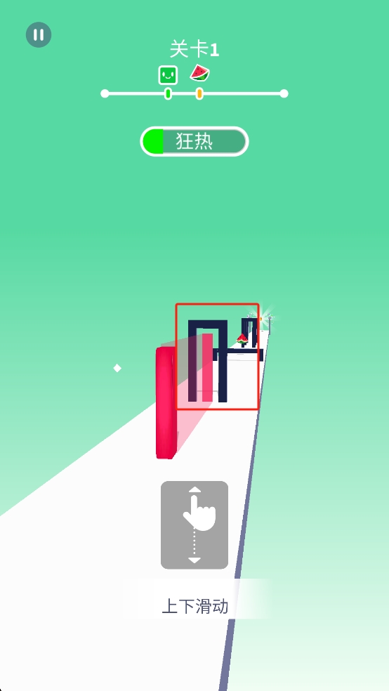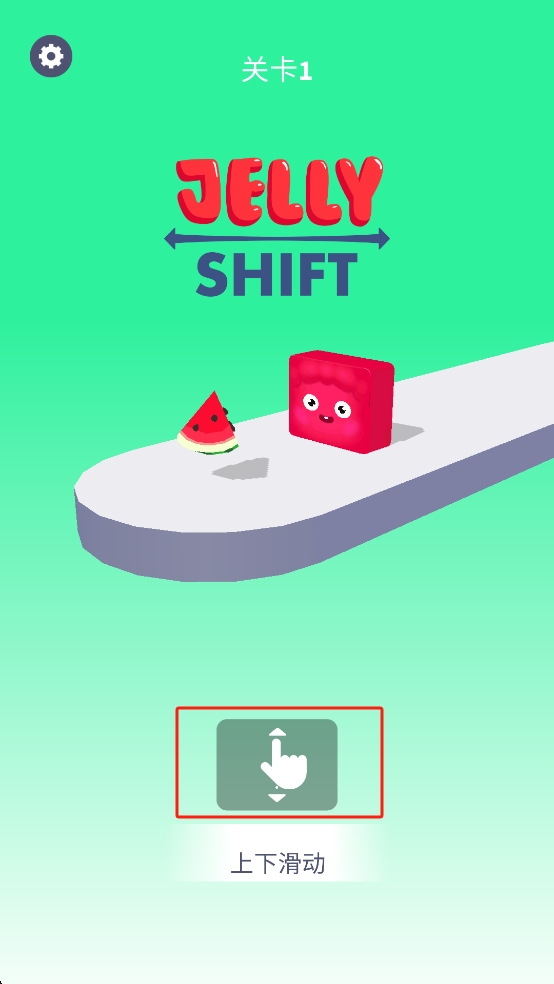 1、進(jìn)入關(guān)卡1,按上下滑動(dòng)提示,滑動(dòng)屏幕控制紅色果凍方塊變形,調(diào)整形態(tài)避開(kāi)障礙,朝著西瓜方向移動(dòng)。