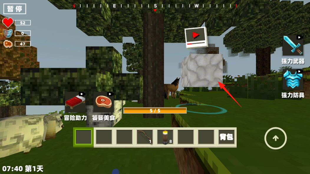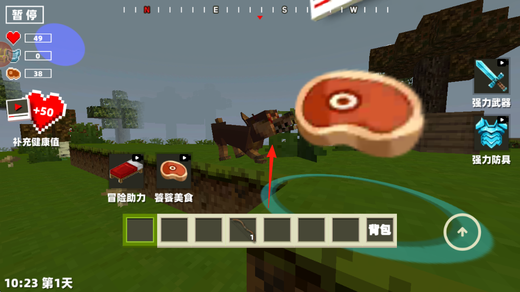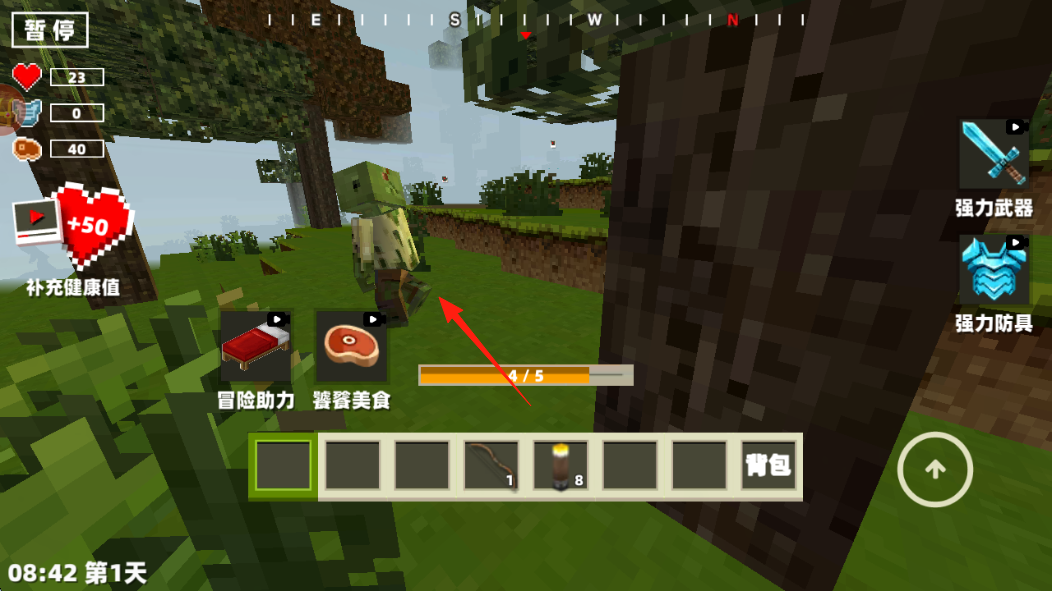2、遇僵尸、野狼等怪物,用弓箭快捷欄攻擊,注意血量心形、飽食度牛排,殘血點補充健康值恢復。