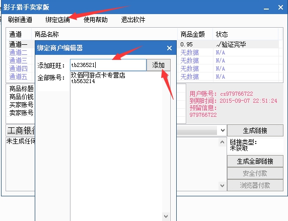 激活賬號之后,登陸賬號,綁定需要遠(yuǎn)程付款的賣家店鋪旺旺昵稱,請按照下圖操作,添加完畢,關(guān)閉軟件即可(如果添加旺旺錯誤或者需要更換旺旺昵稱,鼠標(biāo)點(diǎn)擊輸入錯誤賬號,按鍵盤上的刪除鍵即可)