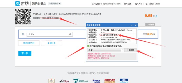 2.賣家登陸賣家付款端,獲取遠(yuǎn)程并驗(yàn)證信息(同時保鏢服務(wù)器會自動去核對是否真實(shí)付款店鋪鏈接)(如果不屬于你店鋪付款鏈接則會提示商戶綁定信息不符合,然后自動關(guān)閉軟件,如果確定自己遠(yuǎn)程沒有點(diǎn)錯付款店鋪上傳信息,則買家使用了修改數(shù)據(jù)程序,屬于騙子行為)