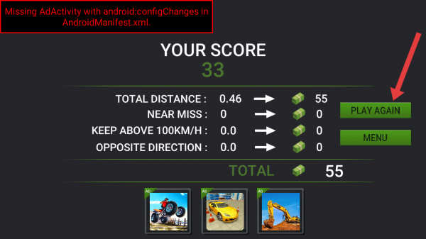 3、如果在駕駛道路上碰撞到其他車輛則失敗,結(jié)算后點擊PLAY AGAIN,重新挑戰(zhàn)改關(guān)卡。