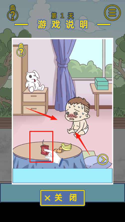 3、搞明白東西能隨便拖動(dòng)后,你就試著拿物品逗寶寶玩,等寶寶狀態(tài)變了,點(diǎn)右下角的箭頭就能去下一關(guān),每個(gè)場(chǎng)景都有新花樣哦。