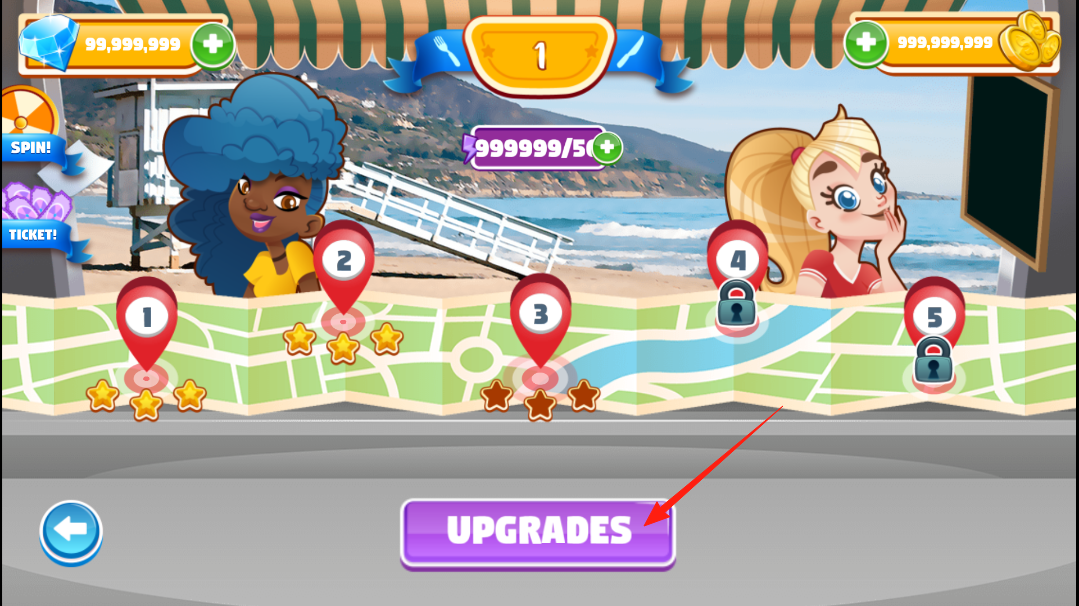 1、點開UPGRADES就能升級餐廳啦,可以用鉆石或者金幣來提升各種功能,比如讓做菜更快,或者讓店里能坐更多客人,升級后玩起來會更輕松哦。