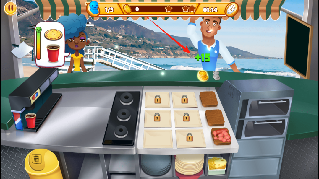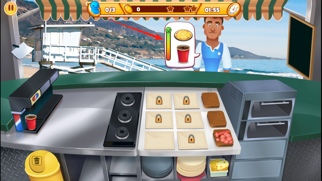 2、注意看客人頭頂?shù)臍馀?,那里會顯示他們想吃什么,看到披薩或者咖啡的訂單后,去廚房找到對應的材料做好,再端給客人就能完成任務拿到獎勵。
