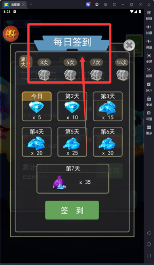 1、每日上線第一時(shí)間要查看您的簽到獎(jiǎng)勵(lì)哦,得到大量資源,方便后續(xù)游戲體驗(yàn)哦。