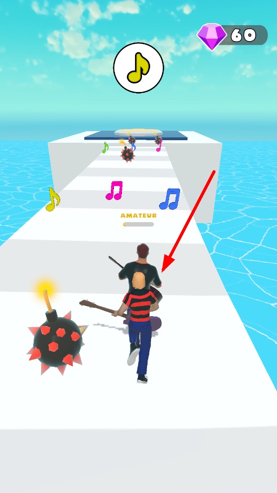 1、進(jìn)入游戲后選擇心儀的樂隊(duì)角色,踏上音樂賽道,點(diǎn)擊屏幕控制角色跳躍,躲避初始階段的路障、水坑等障礙,觀察所需要的音符樣式。