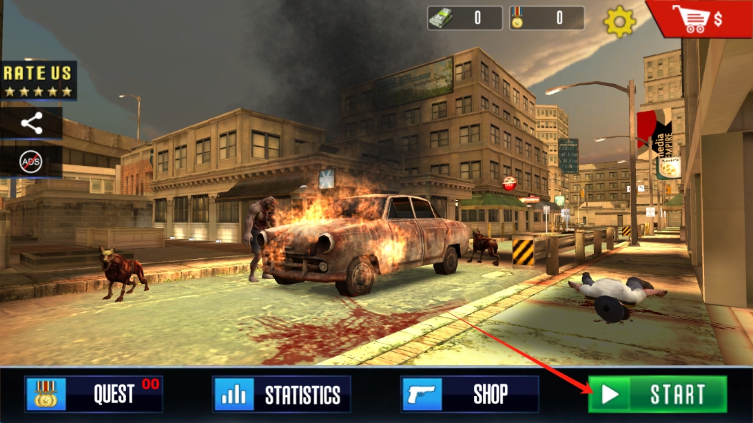 1、初始界面,點(diǎn)擊START,進(jìn)入僵尸射擊戰(zhàn)斗游戲,點(diǎn)擊按鈕進(jìn)入到游戲頁面當(dāng)中。