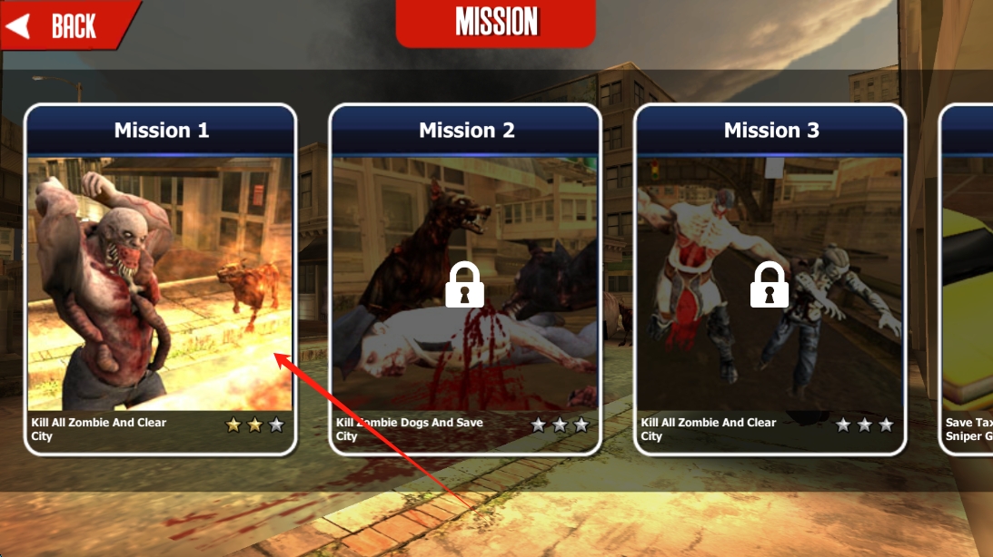 2、任務(wù)選擇,點(diǎn)擊Mission-1,明確殺死僵尸、清理城市的任務(wù)目標(biāo),點(diǎn)擊選擇關(guān)卡。