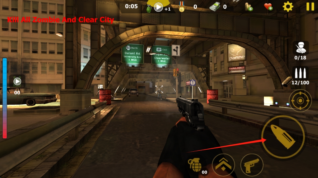 3、關(guān)卡界面,操控角色移動射擊,及時(shí)點(diǎn)擊彈藥圖標(biāo)補(bǔ)充彈藥,完成僵尸清理,點(diǎn)擊射擊敵人。