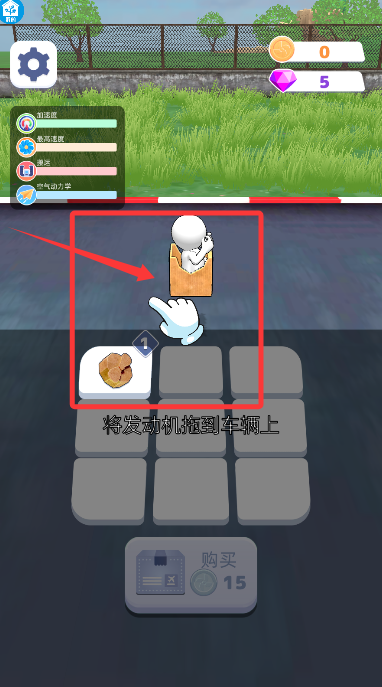 2、在車輛組裝界面,把發(fā)動(dòng)機(jī)拖拽到白色小人所在的車輛上,完成車輛組裝。